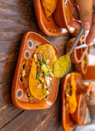 A bowl with your choice of meat (grilled or shredded chicken, carnitas, al pastor, or vegetarian) rice, beans, cheese, sour cream, guacamole, and pico de gallo.