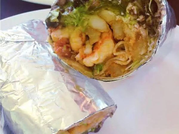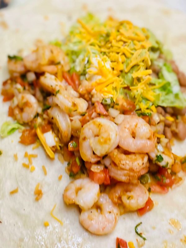 A flour tortilla filled with shrimp, rice, pinto beans, cheese, sour cream, guacamole, lettuce, and pico de gallo.