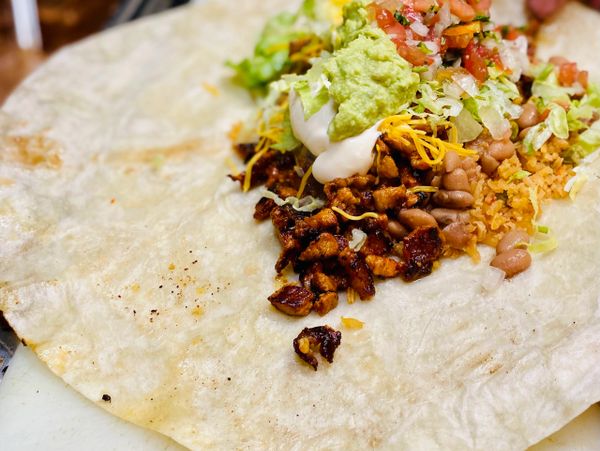 A flour tortilla filled with your choice of meat (grilled or shredded chicken, carnitas, or al pastor)rice, refried beans, cheese, sour cream, guacamole, lettuce, and pico de gallo.