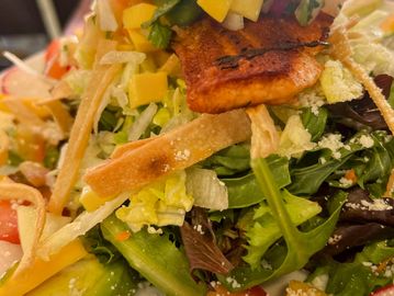 Grilled salmon, spring mixed salad, avocado, tomato, cucumber, and mango salsa tossed in a lemon garlic dressing.