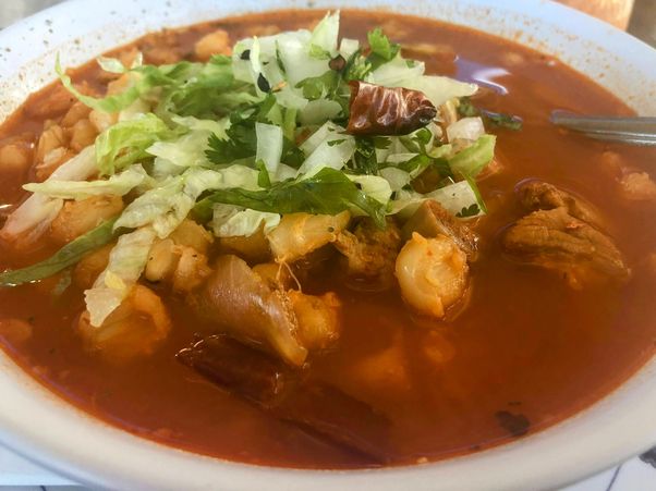 A traditional Mexican red stew made with hominy and pork. Served Cilantro, onions, oregano, dry chili pepper, and corn tortillas.